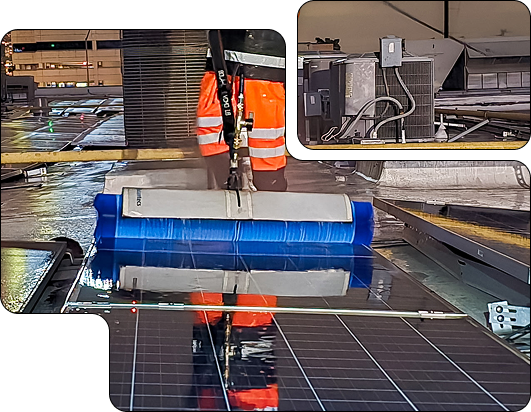 Deploy Sunbotics robotic cleaning systems where possible for maximum efficiency, or utilize C1000 waterfed rotary brushes for sites where robots are not optimal